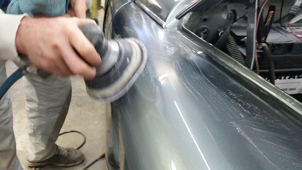 Dabei wird zuerst der genaue Farbton der beschädigten Stelle ermittelt. Danach werden die Lackschichten entfernt, das Blech ausgebeult und für die Lackierung vorbereitet. Es folgt das Reinigen sowie das Schleifen und Ausgleichen der Reparaturstelle mit professionellem Spachtel. Da der Untergrund dafür sauber und glatt sein muss, schleifen und reinigen wir diesen zweimal.